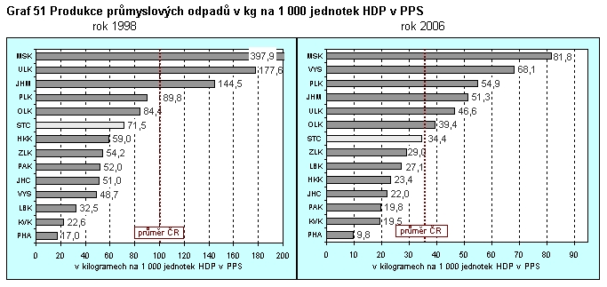 Graf 51 Produkce průmyslových odpadů v krajích v roce 1998 a 2006 v kg na 1 000 jednotek HDP
