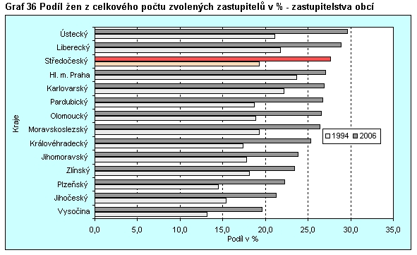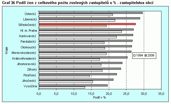 Graf 36 Podíl žen z celkového počtu zvolených zastupitelů v % - zastupitelstva obcí
