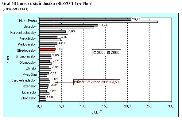 Graf 48 Emise oxidů dusíku (REZZO 1-4) v t/km2