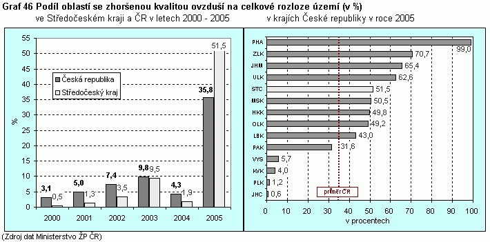 Graf 46 Podíl oblastí se zhoršenou kvalitou ovzduší na celkové rozloze území
