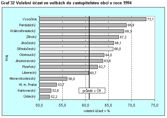 Graf 32 Volební účast ve volbách do zastupitelstev obcí v roce 1994