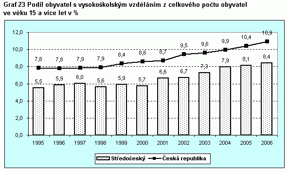 Graf 23 Podíl obyvatel s vysokoškolským vzděláním z počtu obyvatel ve věku 15 a více let v %