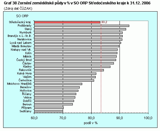 Graf 38 Zornění zemědělské půdy v % v SO ORP Středočeského kraje k 31. 12. 2006