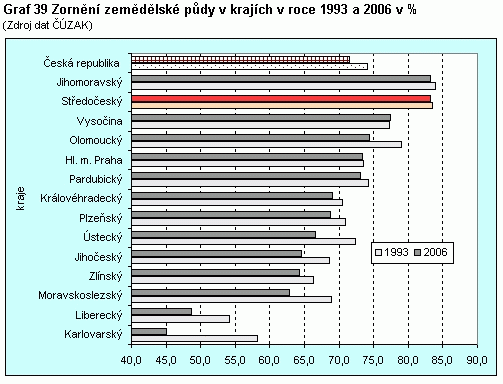 Graf 39 Zornění zemědělské půdy v krajích v roce 1993 a 2006 v %