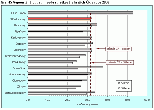 Graf 45 Vypouštěné odpadní vody splaškové v krajích ČR v roce 2006 (v m3 na obyvatele)