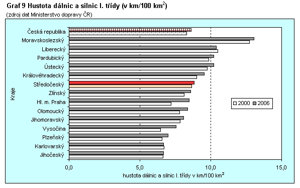 Graf 9 Hustota dálnic a silnic I. třídy (v km/100 km2)