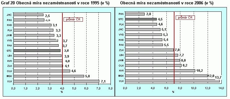Graf 20 Obecná míra nezaměstnanosti v krajích v roce 1995 a 2006 v %
