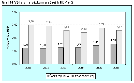 Graf 14 Výdaje na výzkum a vývoj k HDP v %