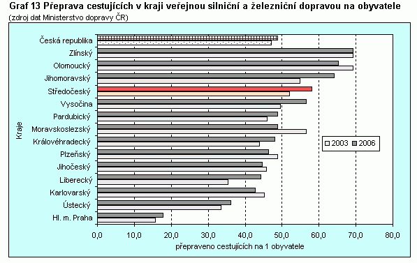 Graf 13 Přeprava cestujících v rámci kraje veřejnou silniční a železniční dopravou na obyvatele