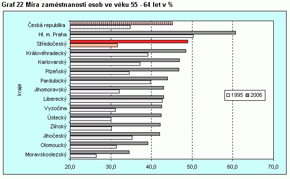 Graf 22 Míra zaměstnanosti osob ve věku 55 - 64 let v %