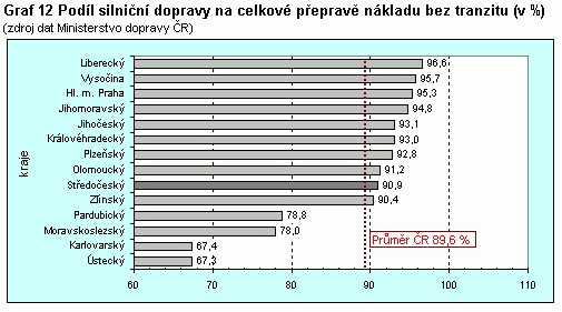 Graf 12 Podíl silniční dopravy na celkové přepravě nákladu bez tranzitu (v %)