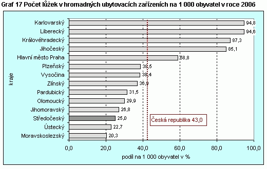 Graf 17 Podíl lůžek v ubytovacích zařízeních v krajích na 1 000 obyvatel v roce 2006