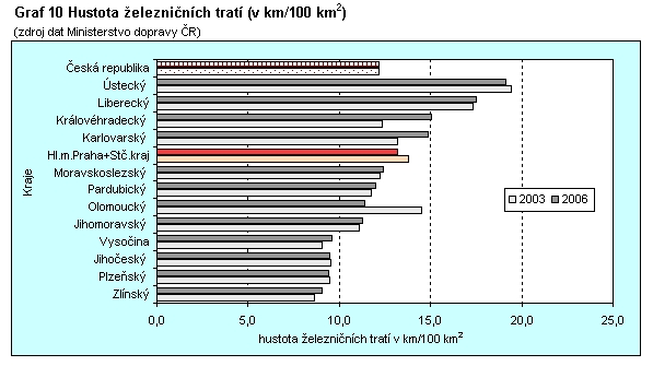 Graf 10 Hustota železničních tratí (v km/100 km2)