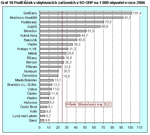 Graf 18 Podíl lůžek v ubytovacích zařízeních v SO ORP na 1 000 obyvatel v roce 2006