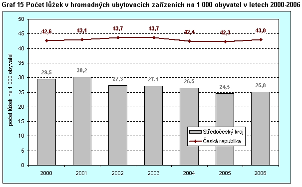 Graf 15 Počet lůžek v hromadných ubytovacích zařízení na 1 000 obyvatel v letech 2000-2006