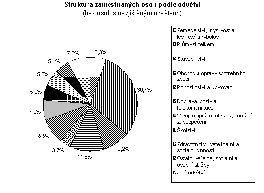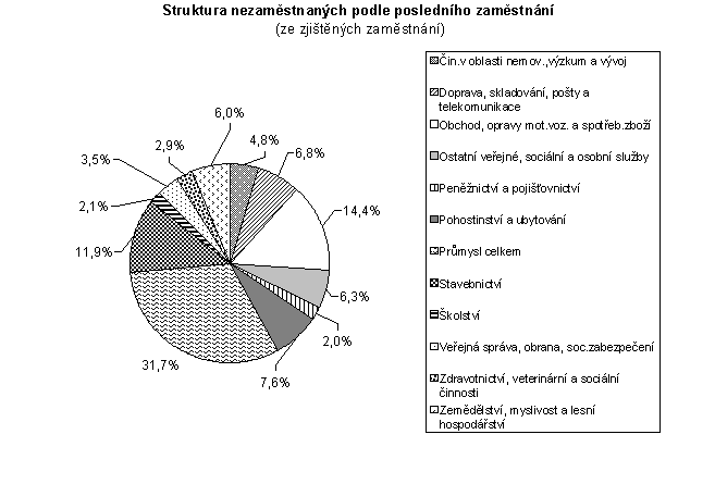 Odvětvová struktura nezaměstnaných osob se posuzuje podle jejich posledního vykonávaného zaměstnání. Z celkového počtu 40 610 ve sčítání 2001 zjištěných nezaměstnaných osob jich 24 290 (tj. 59,8 %) své předchozí zaměstnání neuvedlo. Tím je odvětvová struktura nezaměstnaných do značné míry zkreslena. Z nezaměstnaných osob s uvedeným předchozím zaměstnáním jich dříve pracovalo 31,7 % v průmyslu, 14,4 % v odvětví obchodu, ve stavebnictví pracovalo 11,9 %, v pohostinství a ubytování 7,6 % a v zemědělství 6,0 %. Relativně nejméně nezaměstnaných dříve pracovalo v peněžnictví a pojišťovnictví (2,0 %) a ve školství (2,1 %).