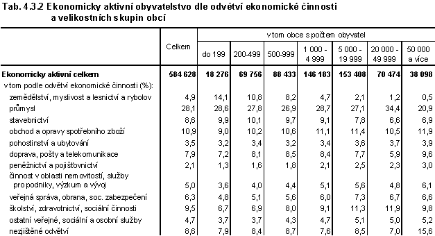 Nejvyšší podíl osob pracujících v průmyslu byl ve velikostní skupině 20 000 - 49 999 obyvatel (34,4 %) a nejnižší podíl pracujících v tomto odvětví – 20,9 % byl zaznamenán ve velikostní skupině nad 50 000 obyvatel. Ve stavebnictví pracovalo nejvíce osob z obcí velikostní skupiny 200 - 499 obyvatel, nejnižší podíl osob pracujících ve stavebnictví byl zjištěn ve skupině obcí 20 000 - 49 999 obyvatel (6,6 %). V odvětví obchodu se podíl pohyboval od 9,0 % v nejmenší velikostní skupině do 11,9 % ve skupině obcí nad 50 000 obyvatel a prakticky plynule rostl s rostoucí velikostí obcí.
