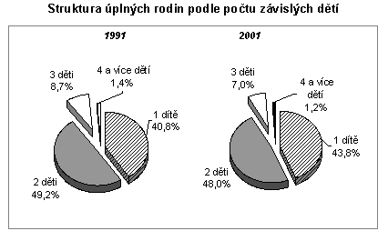 Mění se i složení úplných rodin podle počtu závislých dětí. Proti roku 1991 se v roce 2001 zvýšilo zastoupení úplných rodin bez závislých dětí na celkovém počtu úplných rodin z 46,1 % na 54,9 %, to je téměř o 9 procentních bodů. U úplných rodin s jakýmkoliv počtem závislých dětí došlo proti roku 1991 k poklesu. Nejvíce se proti roku 1991 snížil podíl úplných rodin se dvěma závislými dětmi, a to o 4,9 procentního bodu.