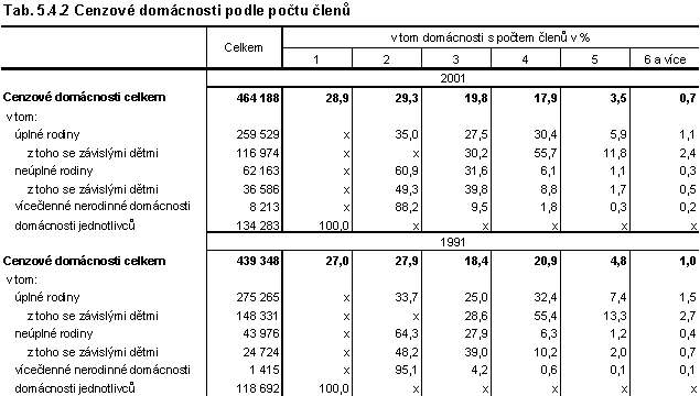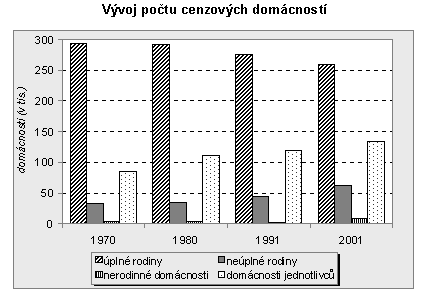 Proti roku 1991 se výrazně snížil počet úplných rodin se závislými dětmi. Jejich počet poklesl o 31 357, tj. o více než 21 %. Podíl úplných rodin se závislými dětmi na celkovém počtu cenzových domácností klesl proti roku 1991 o 8,6 procentního bodu. I když se počet úplných rodin bez dětí proti roku 1991 zvýšil o 12,3 %, došlo v souhrnu ke snížení počtu úplných rodin celkem o 5,7 %. Ve všech ostatních kategoriích cenzových domácností došlo proti roku 1991 z demografického hlediska k nepříliš žádoucím nárůstům.