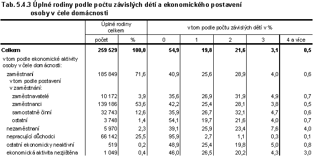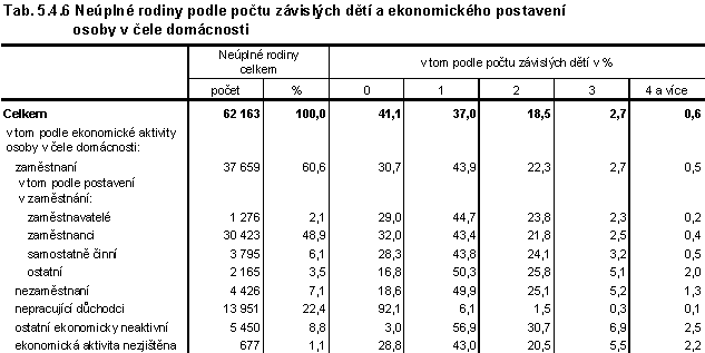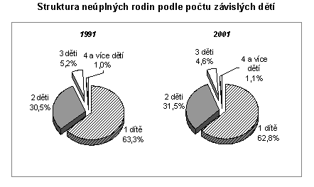Nepříznivý vývoj se projevil především u neúplných rodin se závislými dětmi, jejichž počet se proti roku 1991 zvýšil o 11 862, tj. o více než 48 %. Ve většině těchto rodin, převážně v čele s matkou, bylo pouze jedno závislé dítě (62,8 %), více než 31 % tvořily rodiny se dvěma závislými dětmi. Podíl neúplných rodin se závislými dětmi na celkovém počtu cenzových domácností se proti roku 1991 zvýšil o 2,3 procentního bodu.