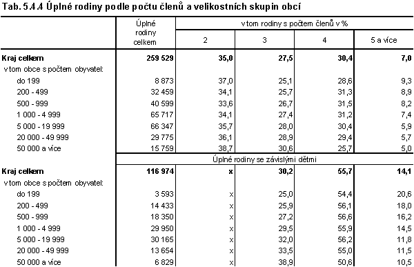V úplných rodinách se závislými dětmi výrazně ve všech velikostních skupinách převažují domácnosti čtyřčlenné (což jsou vlastně manželské páry se dvěma závislými dětmi). Nejvyšší podíl čtyřčlenných rodin je ve velikostní kategorii 500-999 obyvatel, nejnižší podíl v největší velikostní skupině obcí. Zastoupení tříčlenných úplných rodin se závislými dětmi roste s velikostí obce od 25,0 % do 38,9 %. Naopak podíl úplných rodin s pěti a více členy je nejvyšší ve velikostní kategorii do 199 obyvatel a postupně klesá až na 10,5 % v největší velikostní skupině obcí.