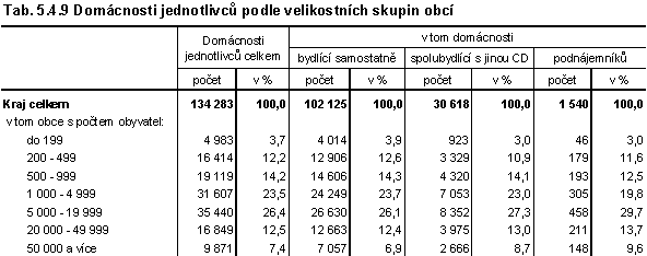 Podíl domácností jednotlivců je vysoký ve všech velikostních skupinách obcí, i když se v závislosti na velikosti obce poněkud liší. Nejvyšší podíl domácností jednotlivců na celkovém počtu cenzových domácností měly obce do 199 obyvatel (31,4 %) a dále největší velikostní skupina nad 50 000 obyvatel (31,5 %). Relativně nejméně domácností jednotlivců bylo v obcích s 500-999 obyvateli (27,5 %). Liší se i způsob bydlení. Nejvíce samostatně bydlících domácností je v obcích s 5 000-19 999 obyvateli (26,1 %), nejméně samostatně bydlících domácností jednotlivců mají obce do 199 obyvatel (3,9 %). Obdobné rozložení počtu domácností je i u domácností jednotlivců spolubydlících s jinou cenzovou domácností a domácností jednotlivců bydlících jako podnájemníci.