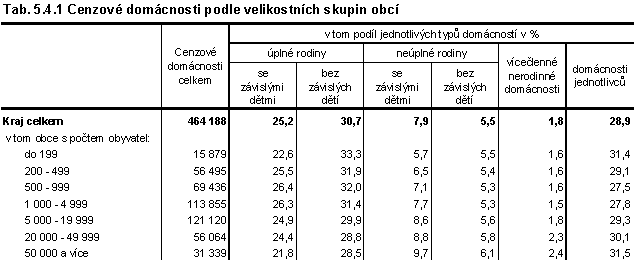 Podíl úplných rodin bez závislých dětí je nejvyšší v obcích do 199 obyvatel . U neúplných rodin se závislými dětmi podíl na celkovém počtu rodin se závislými dětmi stoupá s velikostí obce od 5,7 % u nejmenších obcí až do 9,7 % u obcí nad 50 000 obyvatel. Nejvyšší zastoupení vícečlenných nerodinných domácností (2,4 %) a domácností jednotlivců je v největší velikostní kategorii nad 50 00 obyvatel.