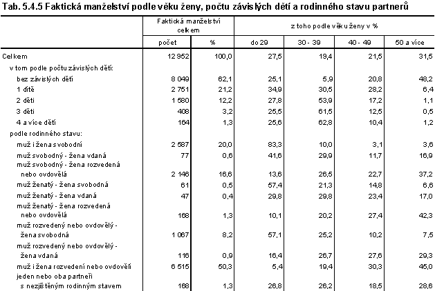 Část úplných rodin tvoří tzv. faktická manželství , kdy spolu žijí partneři ve vztahu druh – družka. Ve faktických manželstvích (tj. soužití nesezdaných dvojic) žilo v roce 2001 ve Středočeském kraji celkem 7 288 dvojic. Nejvyšší zastoupení ve faktických manželstvích společně bydlících osob má soužití rozvedených, nebo ovdovělých mužů a žen (cca 50 % z počtu faktických manželství). Celkem 2 587 faktických manželství společně bydlících osob, tj. 20 % z celkového počtu tvořili oboustranně svobodní muži a ženy.