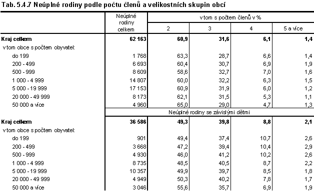 Rozdíly ve struktuře neúplných rodin jsou i mezi jednotlivými velikostními skupinami obcí. Počet neúplných rodin se od nejmenších obcí postupně zvyšuje až na 17 153 v obcích s 5 000-19 999 obyvateli, ve dvou největších velikostních kategoriích obcí potom dochází k dost značnému poklesu. Podle počtu členů mají celkově nejvyšší zastoupení dvoučlenné rodiny, které dosahují nejvyššího zastoupení v největší velikostní kategorii nad 50 000 obyvatel, ale rozdíly zastoupení dvoučlenných rodin mezi jednotlivými velikostními kategoriemi nejsou nijak zvlášť výrazné. V neúplných rodinách se závislými dětmi rovněž převažují dvoučlenné rodiny, i když menším podílem (49,3 %), než v neúplných rodinách celkem. Nejvyšší zastoupení dvoučlenných rodin se závislými dětmi je v nejvyšší velikostní kategorii nad 50 000 obyvatel (55,6 %), nejméně dvoučlenných rodin je v obcích s 500-999 obyvateli (46,0 %). Nejvíce tříčlenných rodin se závislými dětmi je zastoupeno v obcích s 500-999 obyvateli (41,2 %), nejnižší podíl tříčlenných neúplných rodin se závislými dětmi je v kategorii nad 50 000 obyvatel (35,7 %). Čtyř a pěti a vícečlenné neúplné rodiny se závislými dětmi převažují v nejnižších velikostních skupinách obcí, s rostoucí velikostí obce se jejich podíl dost rychle snižuje.