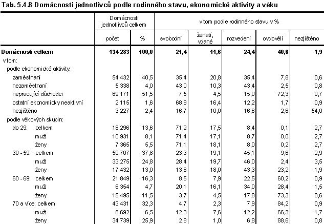 Z celkového počtu domácností jednotlivců bydlelo 76,1 % samostatně v bytě, 22,8 % bydlelo jako spolubydlící a 1,1 % jako podnájemník. Ženy se na celkovém počtu domácností jednotlivců podílely 55,9 %. Více než 40 % z celkového počtu představovaly domácnosti ovdovělých osob. Obyvatelé v produktivním věku se v úhrnu podíleli na celkovém počtu domácností 51,4 % a 48,6 % domácností tvořily tedy osoby ve věku nad 60 let. Ve věkovém složení je velmi výrazný rozdíl mezi domácnostmi jednotlivců - mužů a domácnostmi jednotlivců – žen. Zatímco u mužů je podíl osob ve věku nad 60 let pouze 25,4 % a v produktivním věku je 74,6 % osob, u domácností jednotlivců - žen je to naopak. Podíl žen ve věku nad 60 let v domácnostech jednotlivců dosahuje 67,0 % a podíl žen v produktivním věku pouze 33,0 %.