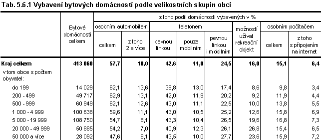 Kromě osobních počítačů a rekreačních možností nejsou výrazné rozdíly v úrovni vybavení podle velikostních skupin obcí. Markantnější rozdíl je vidět u možnosti užívat rekreační objekt, kde tuto možnost má 19,6 % bytových domácností v obcích od 5 000 do 19 999 obyvatel a téměř 27 % domácností v obcí s 20 000- 49 999 obyvateli. Podíly domácností, které mohou využívat rekreační objekt jsou u těchto nejvyšších velikostních kategorií obcí dvoj až trojnásobné oproti domácnostem v menších obcích. Rozdíl je dán charakterem osídlení, kdy značná část venkovských obcí leží na území využívaném k rekreaci, kde zřejmě obyvatelé těchto obcí, na rozdíl od obyvatel velkých měst, nemají zájem mít, nebo využívat objekt k rekreaci.