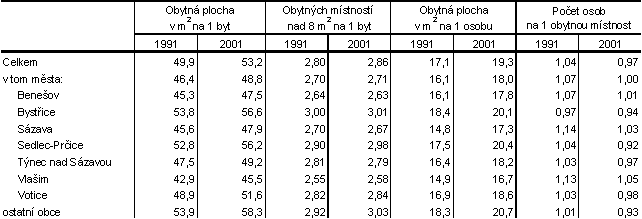 Porovnání let 1991 a 2001 ukazuje, že v tomto období poklesl počet osob bydlících v bytech. V roce 1991 bydlelo v jednom bytě v průměru 2,87 osob, v roce 2001 jen 2,76. S rostoucí velikostí bytů se snížil i průměrný počet osob na jednu obytnou místnost z 1,03 v roce 1991 na 0,97 v roce 2001, přičemž počet obytných místností nad 8 m 2 na 1 byt vzrostl od posledního sčítání z 2,80 na 2,86. Průměrná obytná plocha jednoho bytu vzrostla proti roku 1991 o 3,2 m 2 a dosáhla v roce 2001 celkem 53,2 m 2 . Průměrná obytná plocha na jednu osobu se zvýšila z 17,4 m 2 v roce 1991 na 19,3 m 2 v roce 2001.Tab. 19 Charakteristika trvale obydlených bytů a úroveň bydlení ve městech a ostatních obcích