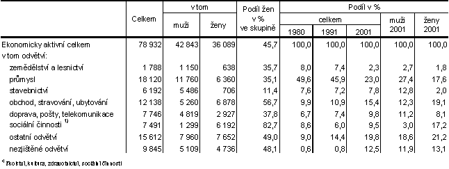 Ekonomicky aktivní ženy mají největší absolutní zastoupení v odvětví obchodu, stravování a ubytování a podílí se téměř 57 % na celkovém počtu ekonomicky aktivních osob v tomto odvětví.