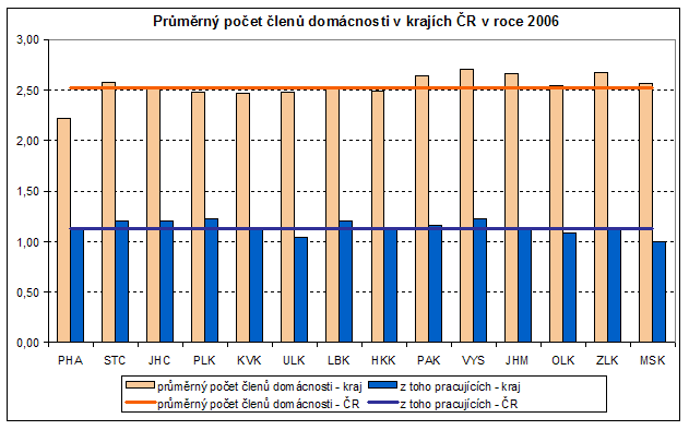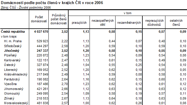 Podle výsledků šetření má nejvyšší počet domácností Hlavní město Praha (13 % domácností ČR) a naopak nejnižší počet domácností má nejmenší kraj ČR - Karlovarský kraj (3,0 % domácností ČR). Vedle nejvyššího počtu domácností byl v Hl. městě Praze zjištěn nejnižší průměrný počet členů domácnosti (2,22 osob). Republikový průměr 2,52 členů na domácnost nejvýrazněji přesáhl kraj Vysočina (2,70 osob na domácnost). Jihočeská domácnost má v průměru stejně jako ČR 2,52 členů. Na rozdíl od ČR je v domácnostech Jihočeského kraje nepatrně vyšší podíl pracujících a naproti tomu nepatrně nižší podíl nezaměstnaných a nepracujících důchodců. Podíl nezaopatřených dětí a ostatních členů je shodný.