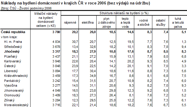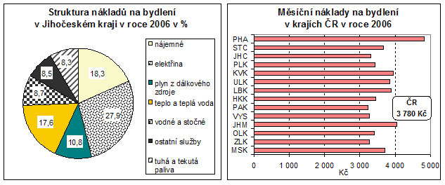 Šetření „Životní podmínky 2006“ také zjišťovalo měsíční náklady na bydlení domácností. Tyto náklady v Jihočeském kraji dosáhly částky 3 317 Kč, což představuje 87,8 % republikového průměru a současně čtvrté nejnižší měsíční náklady na bydlení mezi kraji ČR. Z porovnání struktury nákladů na bydlení v Jihočeském kraji vyplývá, že největší finanční zátěží pro domácnosti jsou platby za elektrickou energii (27,9 %), dále pak za nájemné (18,3 %). Za teplo a teplou vodu domácnosti zaplatily 17,6 % z celkových nákladů a za plyn 10,8 %.