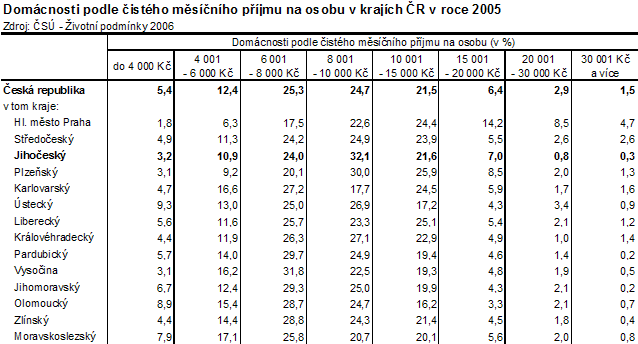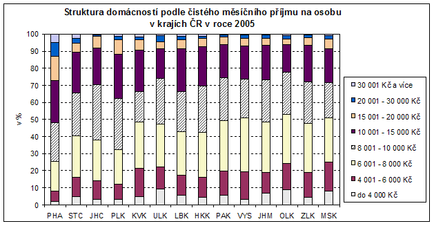 Jiný pohled na strukturu domácností nabízí zkoumání podílů domácností podle výše čistého měsíčního příjmu na osobu. V nejnižším pásmu, tj. s čistým měsíčním příjmem na osobu do 4 000 Kč, se v roce 2005 v ČR ocitlo 5,4 % domácností. Zatímco v Hl. m. Praze byl příjem do 4 000 Kč zjištěn u každé padesáté rodiny, v Ústeckém kraji do této kategorie patřila téměř každá desátá rodina a jen nepatrně lepší situaci zaznamenal v roce 2005 Olomoucký kraj. V Jihočeském kraji do nejnižšího příjmového pásma náležela každá třicátá rodina. Na republikové úrovni a ve většině krajů byly nejvíce zastoupeny domácnosti s měsíčním příjmem v rozpětí 6 001 Kč – 8 000 Kč na osobu (v ČR 25,3 %). Pouze ve Středočeském, Jihočeském, Plzeňském, Ústeckém a Královéhradeckém kraji byly více zastoupeny domácnosti s příjmy 8 001 Kč – 10 000 Kč a v Hl. m. Praze s příjmy 10 001 Kč – 15 000 Kč na osobu. Výjimečnost postavení Hl. m. Prahy dokládá skutečnost, že podíl domácností s čistým měsíčním příjmem na osobu nad 15 tis. Kč zde převyšovaly republikový průměr více než dvojnásobně (v ČR 11 %, v Hl. m. Praze 27 % domácností).