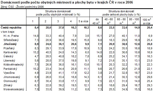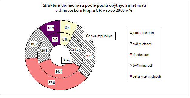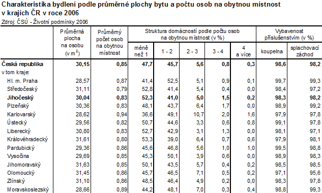 Podle výsledků šetření „Životní podmínky 2006“ bydlí v Jihočeském kraji 36,1 % domácností v bytě se třemi obytnými místnostmi, v bytě se dvěma obytnými místnostmi bydlí 24,6 % domácností, pouze jednu obytnou místnost má k dispozici 8,9 % domácností. Největší procento domácností (38,6 %) bydlí v bytech s obytnou plochou 60 až 80 m2, obytnou plochu do 40 m2 uvedlo 7,1 % domácností. V rámci celé České republiky v bytech s obytnou plochou 60 až 80 m2 žije 33,6 % domácností a nejnižší zjišťovanou obytnou plochu (do 40 m2) uvedlo 8,6 % domácností.