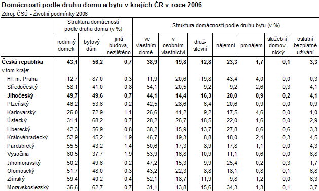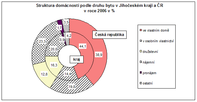 Z porovnání struktury domácností podle druhu domu vyplývá, že 49,7 % domácností v Jihočeském kraji žije v rodinných domech a 49,6 % v domech bytových. Ze struktury podle druhu bytu vyplývá, že nejvíc domácností má byt ve vlastním domě 44,1 %, 20 % domácností bydlí v nájemním bytě, 16,3 % domácností v družstevním bytě, byt v osobním vlastnictví má 14,4 % domácností. V mezikrajovém srovnání se Jihočeský kraj podílem domácností ve vlastním domě a v nájemním bytě řadí na 7. místo, podílem bytů v družstevních bytech na 3. místo a podíl bytů v osobním vlastnictví má téměř nejnižší (13. místo).