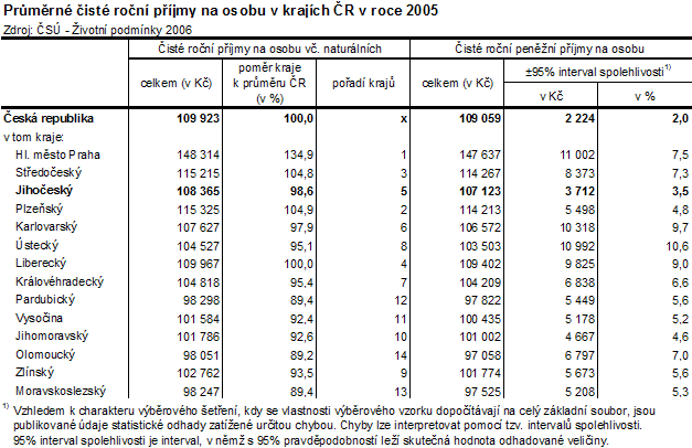Podle výsledků statistického šetření „Životní podmínky 2006“ dosáhly v roce 2005 v ČR hrubé roční peněžní příjmy na osobu 131 812 Kč. Po odečtení srážek na povinné pojištění a daně z příjmů fyzických osob a připočtení naturálních příjmů tak celkové čisté roční příjmy na osobu činily 109 923 Kč. Velké mezikrajové rozdíly (98 051 Kč v Olomouckém kraji – 148 314 Kč v Hl. m. Praze) ovlivňuje nejen rozdílná úroveň mezd, ale roli zde hraje i velikost domácností a jejich struktura podle ekonomické aktivity – podíl pracujících členů v domácnosti (v krajích od 39 do 51 %), závislých dětí či nepracujících důchodců.