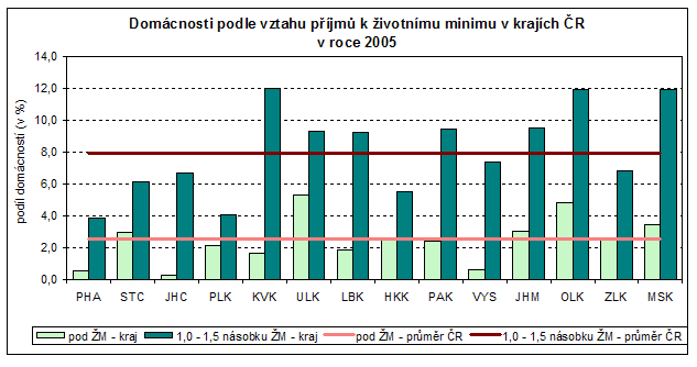 Při hodnocení struktury domácností podle vztahu příjmů k životnímu minimu se v roce 2005 v nejnižší příjmové skupině ocitlo v celé ČR 2,5 % domácností. V Jihočeském kraji byl podíl domácností s příjmem pod hranicí životního minima nejnižší z ČR – 0,3 %. Naopak nejvyšší podíl těchto domácností měl Ústecký kraj - 5,3 %. Vysoké zastoupení domácností s příjmy pod hranicí životního minima bylo také v Olomouckém a Moravskoslezském kraji. Příjem v rozmezí 1,0 až 1,5násobku ŽM vykázalo v ČR 7,9 % domácností. Příjmů nad trojnásobek ŽM (tj. nejvyššího hodnoceného pásma příjmů) dosáhlo v ČR 27,6 % domácností, přitom v Hl. m. Praze bylo jejich zastoupení 47,1 %, zatímco v Olomouckém kraji se jednalo o necelou pětinu domácností. V Jihočeském kraji je podíl takovýchto domácností nepatrně vyšší než průměr za ČR.