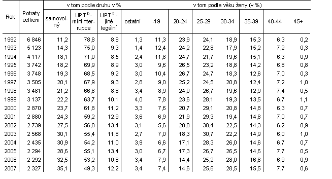 Vývoj celkového počtu potratů od počátku 90. let ovlivnil především pokles počtu umělých přerušení těhotenství. Jejich počet se v roce 2007 proti roku 1992 snížil více než čtyřnásobně a dnes představují 61,5 % celkového počtu potratů (v roce 1992 to bylo 87,6 %). Zvyšuje se tedy podíl samovolných potratů, i když se jejich počet výrazněji nemění. Vysoký podíl samovolných potratů je ve věkových skupinách 25 – 29 let (45,5 %) a 30 – 34 let (39,5 %). Tyto věkové skupiny se vyznačují vysokou plodností, ale také vyšším počtem samovolných potratů jako přirozeného biologického úmrtnostního procesu.