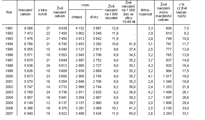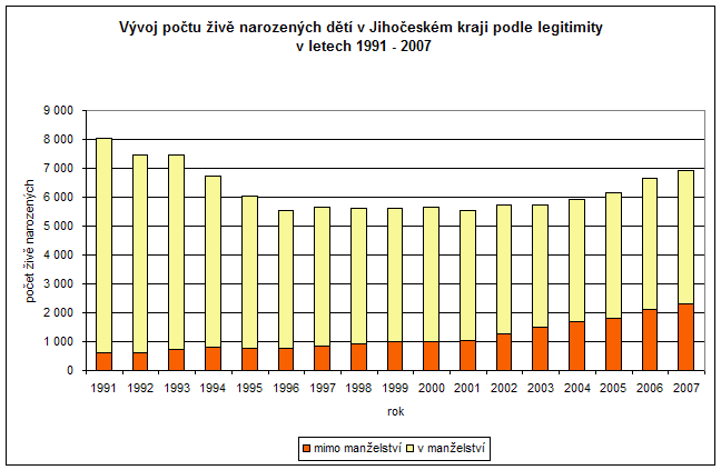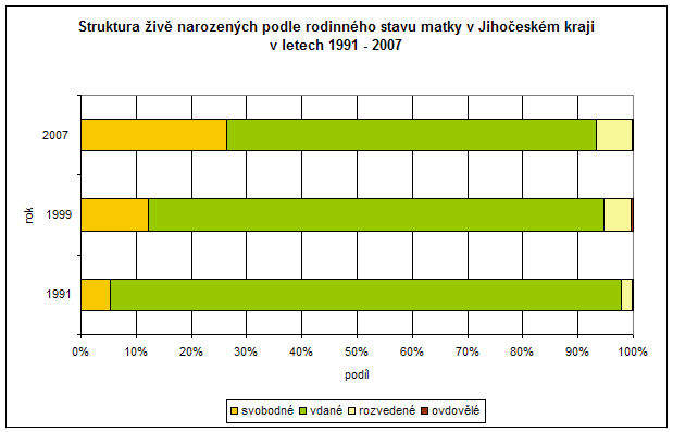 Zvyšující se počet dětí narozených mimo manželství je odrazem liberálnějšího postoje společnosti k těmto dětem i k neprovdaným matkám. Výrazně se proto změnila struktura živě narozených dětí podle rodinného stavu matky. Zatímco v roce 1991 se svobodným matkám narodilo 5,4 % dětí, v dalších se letech se tento podíl zvyšoval a v roce 2007 dosáhl 26,4 %. Počet dětí narozených svobodným matkám se v tomto období zvýšil více než 4krát. Děti narozené rozvedeným matkám představují sice jen malou část celkového počtu živě narozených dětí, ale od roku 1991 jejich počet vzrostl 3krát a jejich podíl se zvýšil z 1,9 % na 6,5 %. Tyto změny se odrazily ve snižujícím se podílu dětí narozených v manželství, který poklesl z 92,5 % v roce 1991 na necelých 67 % v roce 2007.