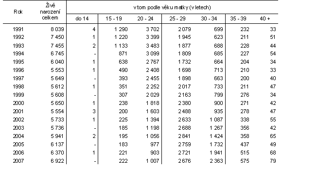 Tyto tendence se odrazily v počtu a podílu dětí narozených matkám v jednotlivých věkových skupinách. V roce 1991 se přes 46 % dětí rodilo matkám ve věku 20 – 24 let, postupně se tento podíl snižoval až na 14,5 % v roce 2007. Zvyšoval se naproti tomu počet dětí narozených matkám ve věku 25 – 29 let. Tyto děti tvořily na začátku 90. let přibližně čtvrtinu všech živě narozených dětí, avšak dnes se tento podíl zvýšil na více než 40 %. Nejvyšší byl v roce 2004, a to 47,8 %. Výrazné bylo rovněž zvýšení podílu dětí narozených matkám ve věku 30 – 34 let, který v roce 2007 překročil 34 %, což je zhruba o 25 procentních bodů více než na počátku 90. let. Podíl dětí narozených matkám v této věkové skupině tak byl druhý nejvyšší. Pozitivně lze hodnotit pokles počtu a podílu dětí, narozených matkám do 20 let. V roce 1991 mělo matku v tomto věku 16 % živě narozených dětí, v roce 2007 to byly pouze 3,2 %.