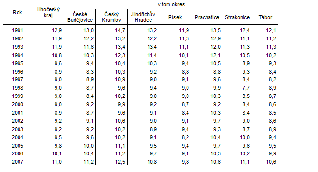 Hrubá míra porodnosti v Jihočeském kraji v letech 1991 - 2007 podle okresů