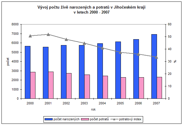 V letech 1991 – 2007 se v Jihočeském kraji úhrnem živě narodilo 106 194 dětí. Největší počet narozených dětí připadá na rok 1991, v následujících letech počet dětí postupně klesal, přičemž nejnižší byl v letech 2001 a 1996. Od roku 2002 se pak meziročně počty narozených dětí zvyšují a odpovídají zhruba úrovni poloviny 90. let. V roce 2007 se však stále narodilo jen 86 % počtu dětí narozených ve výchozím roce sledovaného období a necelých 62 % počtu dětí narozených v roce 1974, kdy se narodilo nejvíce dětí.