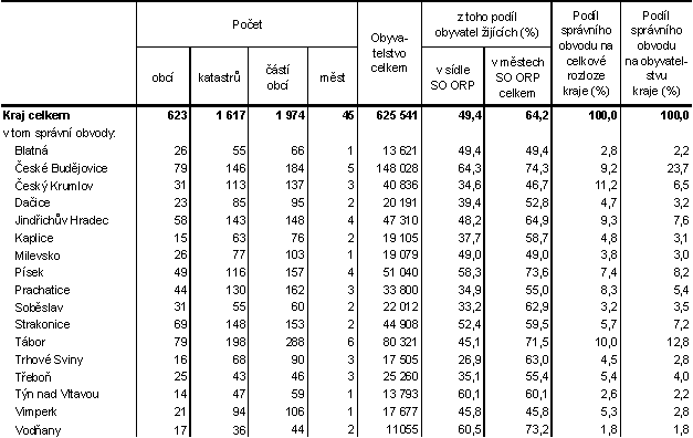 V Jihočeském kraji žilo k 31.12.2003 celkem 625,5 tisíce obyvatel, což představovalo 6,1 % obyvatel celé ČR. Průměrný počet obyvatel správního obvodu dosahoval 36,8 tisíc osob (o 26 % méně než průměr SO ORP v ČR). Nejvíce obyvatel žilo ve správním obvodu České Budějovice (téměř 24 % obyvatel kraje), více než 10 % žilo také v SO Tábor. Nejméně obyvatel (1,8 %) žilo v SO Vodňany, méně než 3 % z obyvatel kraje žilo dále v SO Blatná, Týn nad Vltavou, Trhové Sviny a Vimperk. V samotných sídlech SO ORP žilo v Jihočeském kraji 49,4 % obyvatel, nejvíce v SO České Budějovice (64 %), více než 60 % také v SO Vodňany a Týn nad Vltavou. Menší než 30 % byl tento podíl pouze v SO Trhové Sviny. Jestliže vezmeme v úvahu všechna města regionu, je situace odlišná. Ve 45 městech žilo 64,2 % obyvatel kraje, z jednotlivých správních obvodů byl největší podíl městského obyvatelstva zaznamenán v SO České Budějovice (74,3 %), více jak 70 % dále SO Písek, Vodňany a Tábor. Pod hranicí 50 % naopak zůstává podíl městského obyvatelstva v SO Blatná, Milevsko, Český Krumlov a Vimperk.