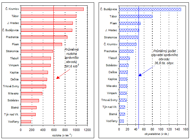 Průměrná velikost správního obvodu je 591,6 km2, nejvíce v celé České republice (o 54 % více než je průměrná velikost v ČR). Největším správním obvodem je Český Krumlov, nejmenším naopak Vodňany. Celkem má kraj 623 obcí (z toho 45 měst) rozčleněných na 1 974 částí. Průměrná rozloha obce dosahuje 16,1 km2, což je o 28 % více než je průměr České republiky. V rámci jednotlivých správních obvodů je největší průměrná rozloha obce v Českém Krumlově (36,5 km2), nejmenší ve Strakonicích (8,3 km2).