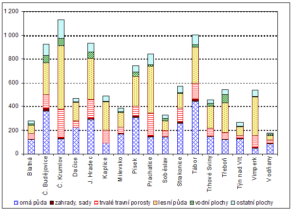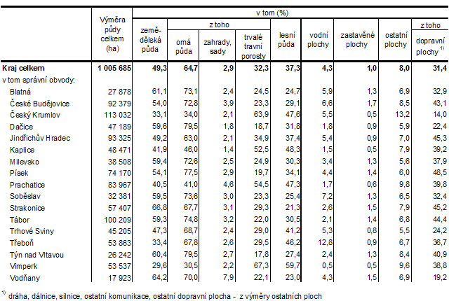 Podíl lesní půdy (37,3 %) je 8. nejvyšší v rámci krajů ČR, podíl vodních ploch (4,3 %) je v ČR nejvyšší. Z jednotlivých SO ORP je nejvyšší podíl lesů v SO Vimperk (59,7 %), více než 40 % lesů je v dalších 5 SO ORP, naopak nejméně (21,3 %) lesů je v SO Strakonice, méně než 25 % jich je dále v SO Vodňany a Blatná. Vodní plochy leží nejvíce (na více než 10 % území) v SO Třeboň, naopak v SO Vimperk představuje podíl vodních ploch pouze 0,5 %.
