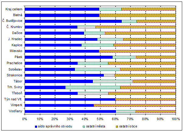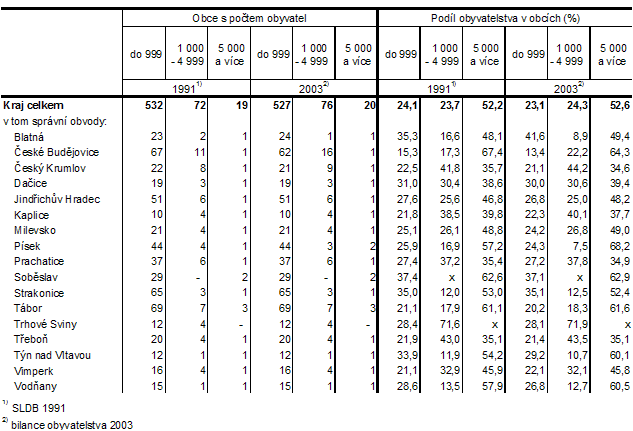 Z celkového počtu 623 obcí žije více než 5 tisíc obyvatel pouze 20 městech. Kromě sídel SO ORP jsou další města s počtem obyvatel nad 5 000 osob jen v SO Tábor (Sezimovo Ústí, Bechyně), SO Písek (Protivín) a SO Soběslav (Veselí nad Lužnicí). Naopak v SO Trhové Sviny nedosahuje hranice 5 000 obyvatel ani samotné sídlení město. V obcích s více než 5 000 obyvateli žije 52,6 % obyvatelstva kraje, podíl obyvatel žijících v těchto obcích se od roku 1991 zvýšil o 0,4 procentního bodu. Naopak v 527 obcích s méně než 1 000 obyvateli žilo v roce 2001 pouze 23,1 % obyvatel, podíl jejich obyvatel se snížil o 1 procentní bod. Podíl počtu obyvatel obcí s méně než 1 tisícem obyvatel na celkovém počtu obyvatel SO ORP vykazuje značné rozdíly, nejvyšší podíl jich je v SO Blatná (41,6 %), více než 30 % jich je v SO Soběslav, Strakonice a Dačice. Méně než 20 % má pouze SO České Budějovice (13,4 %).