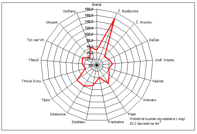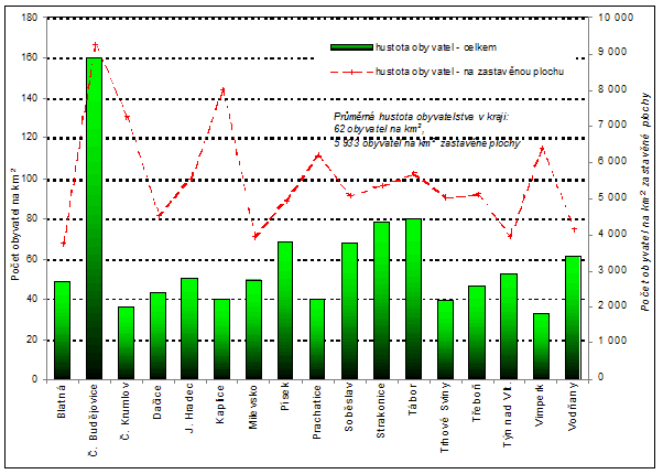 V České republice žije průměrně necelých 130 obyvatel na 1 km2, v Jihočeském kraji je hustota obyvatel nejnižší (pouze 62,2 obyvatele na 1 km2). Z jednotlivých SO ORP je nejvyšší hustota v SO České Budějovice (160,2), Tábor (80,2) a Strakonice (78,2), naopak méně než 40 obyvatel na 1 km2 žije v SO Kaplice, Trhové Sviny, Český Krumlov a Vimperk.